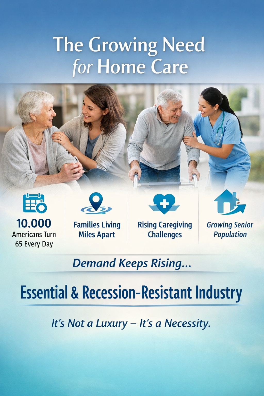 Every day, nearly 10,000 Americans turn 65, a trend expected to continue for years as the population ages. At the same time, families are becoming more geographically spread out, with adult children often living hundreds of miles away from aging parents. Combined with the growing complexity of caregiving, this has created a sustained and increasing demand for reliable in-home care.